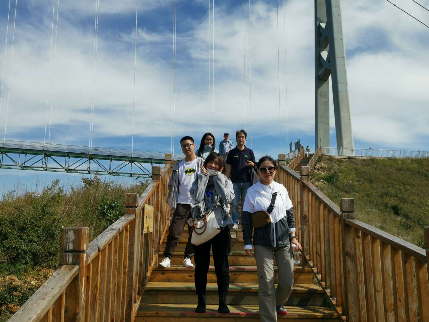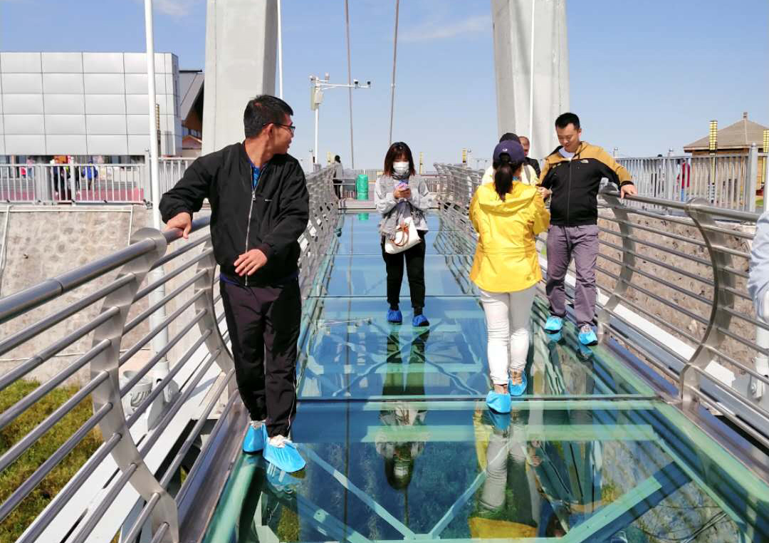 14日下午游覽車載著一行人行駛在山間的小路上,清風徐徐,好不愜意,接著迎來了全長639米的玻璃棧道挑戰(zhàn),驚心動魄,姿態(tài)百出。